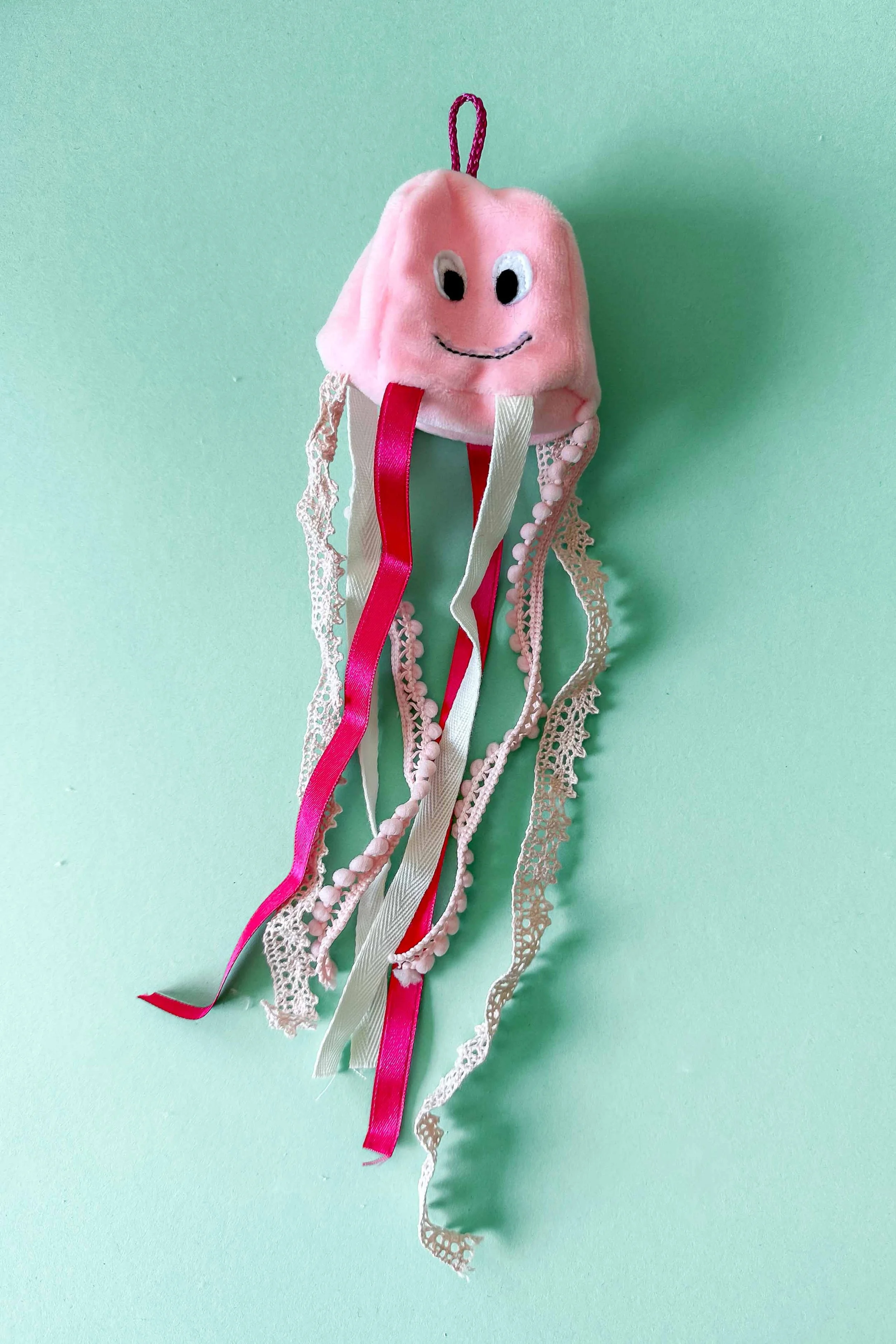 Jetzt kannst noch ein Band zur Verlängerung oben in die Schlaufe einfädeln und die Haarspangenhalter-Qualle aufhängen und mit Haarspangen bestücken.